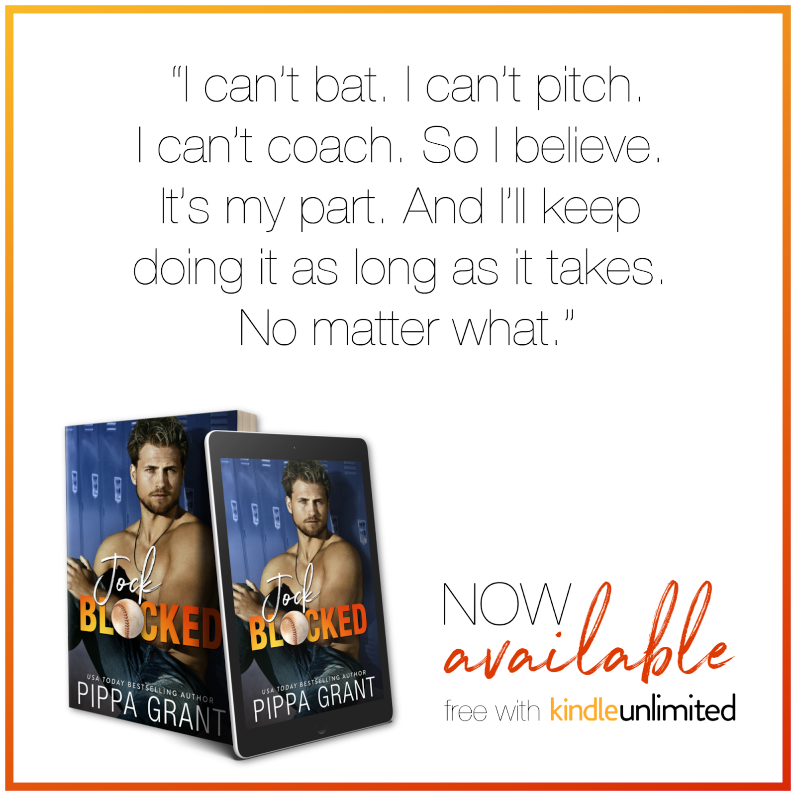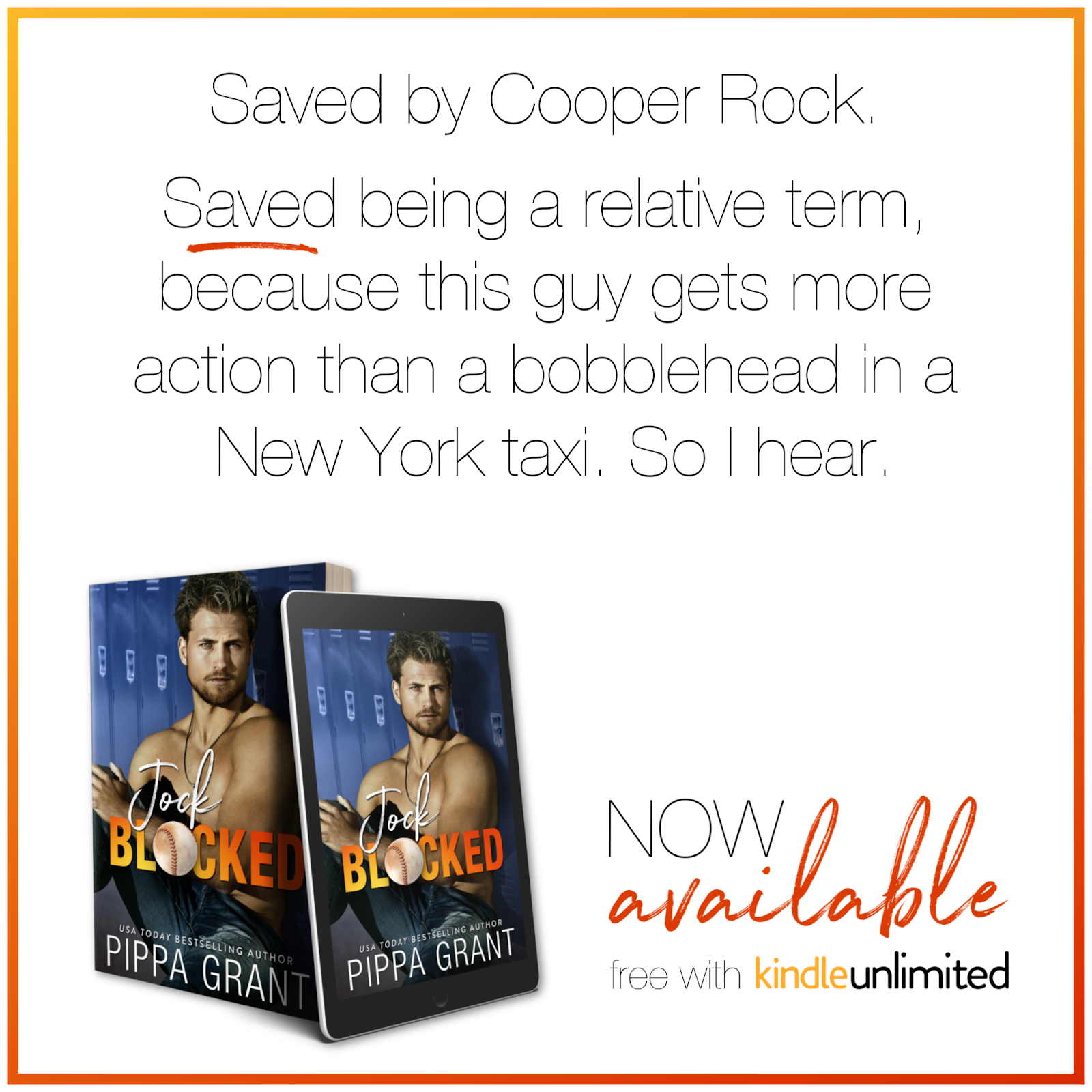 Jock Blocked is a home run of a romantic comedy featuring the world’s most superstitious sports fan, baseball’s oldest virgin hero, a rogue meatball, an adorable puppy with a cussing problem, and the best lovable losers. It stands alone and comes with a happily ever after more satisfying than a game-winning grand slam.